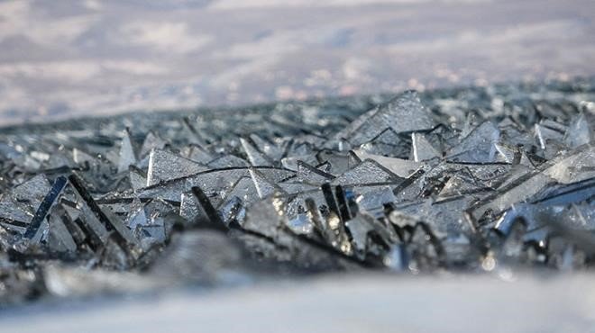Doğu Anadolu Bölgesi’nin Van’dan sonra ikinci büyük gölü olan Çıldır’ın yüzeyi, bu yıl geç de olsa donmaya başladı. Gölün yüzeyini kaplayan buz kütlesi rüzgarın etkisiyle parçalanıp sahile vurdu.