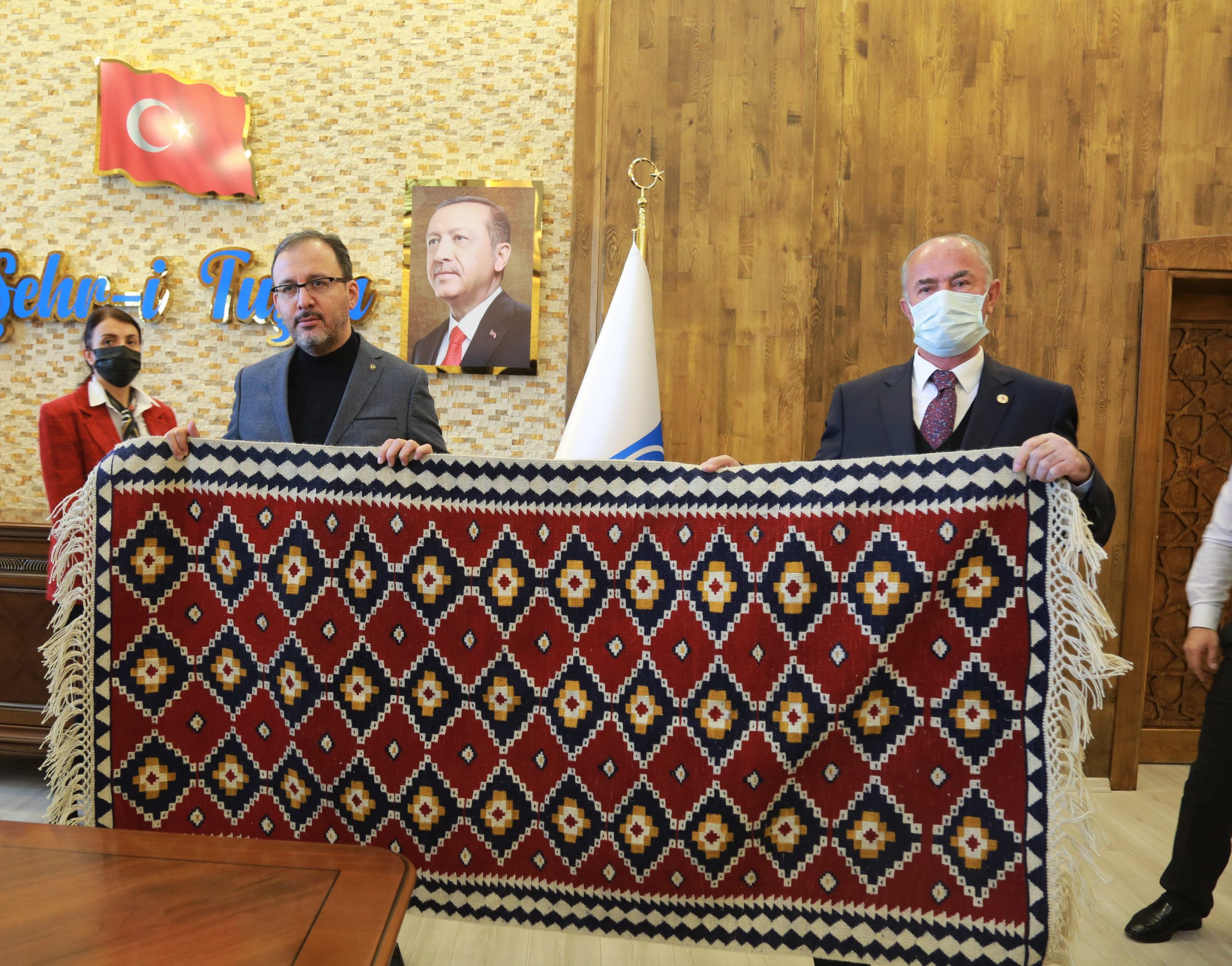 Tuşba Belediye Başkanı Salih Akman’ın, yaşanan pandemiden önce dezavantajlı kadınlara yönelik açılan kilim kursunda üretilen bir ‘Tuşba Kilimi’ hediye ettiği Gençlik ve Spor Bakanı Dr. Mehmet Muharrem Kasapoğlu, bu yıl faaliyete geçen ve mimarisi ile bölgede benzerine az rastlanılan Tuşba Belediyesi Hizmet Binası önünde beraberindekilerle hatıra fotoğrafı çektirdikten sonra ayrıldı.