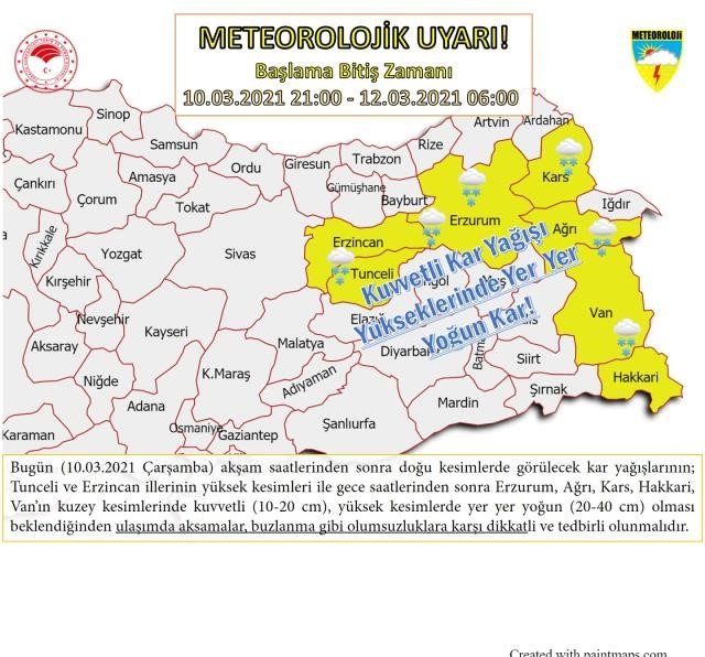 Meteoroloji Genel Müdürlüğü’nden yapılan yazılı açıklamaya göre, doğu kesiminde görülecek karın Tunceli ve Erzincan’ın yüksek kesimleriyle gece saatlerinden sonra Erzurum, Ağrı, Kars, Hakkari ve Van’ın kuzey kesimlerinde kuvvetli (10-20 santimetre), yüksek kesimlerde yer yer yoğun (20-40 santimetre) olması bekleniyor.