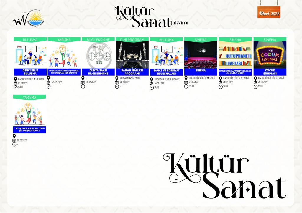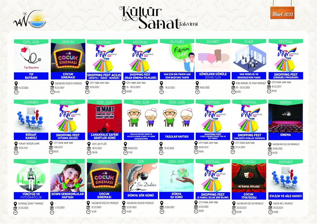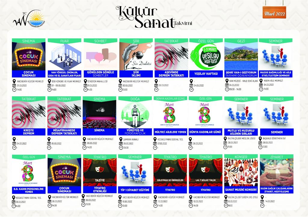 Mart ayında yine Büyükşehir Belediyesi tiyatro gösterileri, şiir programları, sinema gösterimleri, seminerler, festivaller, sanat sergileri ve kadın programlarıyla Mart ayında Vanlılara dolu dolu bir ay geçirtecek.
