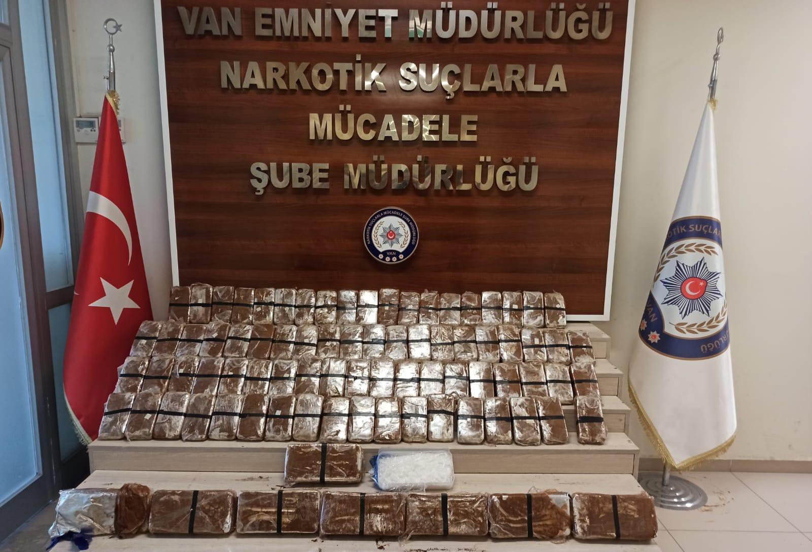 İl Emniyet Müdürlüğünden yapılan açıklamada, “Müdürlüğümüz Narkotik Suçlarla Mücadele Şube Müdürlüğü görevlilerimizce; ilimiz Gevaş ilçesinde seyir halinde bulunan 06 plaka sayılı otomobilin durumundan şüphelenilmesi üzerine; oluşturulan uygulama noktasında durdurulan otomobilde; Narkotik Madde Arama Köpeği Şila ile birlikte yapılan detaylı aramada; aracın şoför ve yolcu koltuğu altına yapılmış zulada (kahveyle narkotik madde arama köpeğinin koku alması engellenmeye çalışılmış) 76 paket halinde toplam 42 kilo 500 gram eroin, 9 paket halinde toplam 9 kilo 682 gram metamfetamin ile 2 bin TL, 400 Euro, 120 bin Suudi Arabistan Riyali ele geçirilmiştir” denildi.